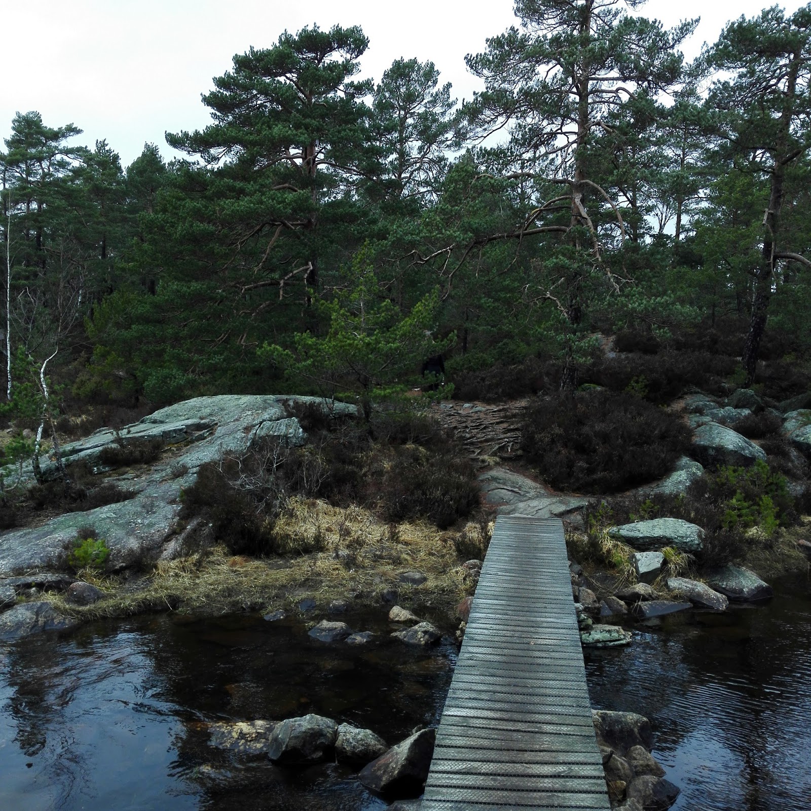 Sunnuntaina meidät oli kutsuttu puolalaisten perinteiselle pääsiäisaamiaiselle. Päivä oli pilvinen, mutta onneksi iltapäivällä ei enää satanut, joten käytiin vielä pyörähtämässä yliopiston takana olevalla patikointireitillä. Täytyy todeta että norjalaiset ovat oikeasti ulkoilukansaa ja tekevät siitä myös mahdollisimman mukavaa. Reittien varrella on usein ulkohuusseja ja lähes joka mutkasta voi löytää jonkun nuotion jäänteet.